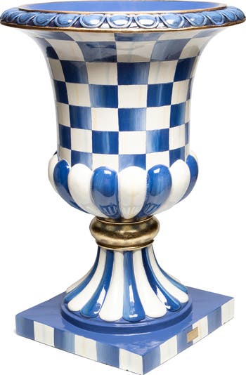 Hand-painted color-dragged checks in an energizing hue that celebrates new beginnings brightens this urn made from durable, weather-resistant materials to welcome guests for years to come.