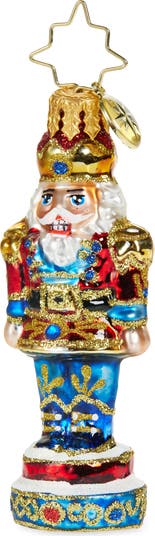 From the regal crown to the crisp uniform stripes, this glass tree ornament turns the nutcracker into a showpiece with a sculpted mustache, polished boots and a base ringed in festive motifs.