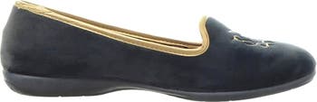 A refined slipper-style flat with subtle embroidered detailing and a sleek, comfortable silhouette. Made in Spain.