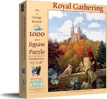 Embark on a picturesque journey of tranquility and elegance with the Royal Gathering 1000-piece jigsaw puzzle by SunsOut. Expertly crafted by George Kovach, it features a serene depiction of nature and animals across a bountiful 23" x 28" area, offering a simultaneously tranquil and challenging experience. Crafted from high-quality, recyclable cardboard featuring SunsOut's unique interlocking design, each piece fits seamlessly together, allowing for the satisfaction of a flawlessly completed puzzle. Not only beautiful, but the SunsOut puzzle also adheres to eco-friendly practices, utilizing recycled materials and soy-based inks. Manufacturered in the USA and proudly woman-owned, SunsOut guarantees quality in every product, promptly resolving any issues with missing or damaged pieces. Immerse yourself in Kovach's artistry, each puzzle piece reflecting the peace and beauty of nature, and feel proud to support a small business dedicated to creativity and innovation. Experience the joy of piecing together the Royal Gathering 1000-piece jigsaw puzzle for moments of blissful tranquility.