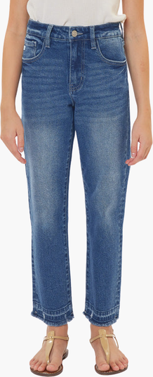 A pair of straight-leg jeans that comes in a medium wash with medium fading and whiskering. Features a released hem, 5-pocket style, and zip fly.