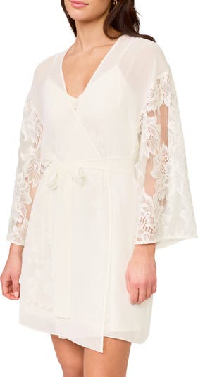 Delicate Chantilly-lace sleeves frame a sheer chiffon robe to bring an ethereal element to your special day and beyond.