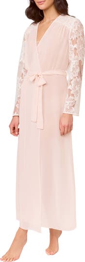 Delicate Chantilly lace–sleeves frame a sheer chiffon robe to bring an ethereal element to your nighttime routine.