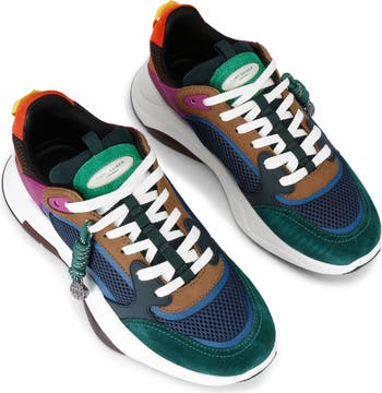Layered vividly colored panels boost the retro appeal of this chunky lace-up sneaker boasting signature eagle's-head hardware and a flared sole.