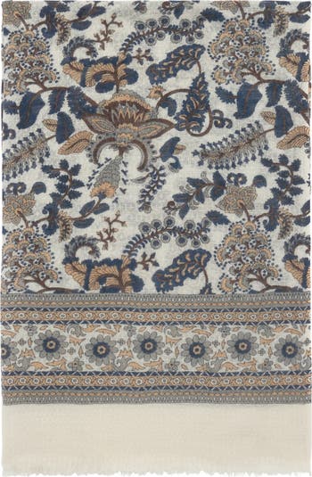Scarf made from wool and silk blend with Indian inspired floral patterns.
