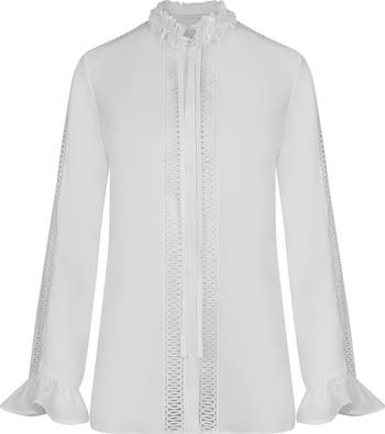 A refined expression of feminine tailoring, the Rozela shirt by Anne Fontaine is crafted in crepe and elevated with intricate lace and ruffle detailing. This softly structured silhouette features a delicate mini ruffle collar accented by an attached self-tie, adding a fluid, romantic finish. The concealed center button placket is framed with a geometric lace insert, lending a sense of texture and precision to the design. The same lace detail continues from the neckline down each sleeve, finishing at a single ruffled cuff that adds an unexpected, asymmetrical touch. Light yet polished, the Rozela captures Anne Fontaine’s signature approach to modern elegance—where classic elements are reimagined with grace and craftsmanship.