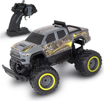 REALTREE: RTR RC - TOYOTA TACOMA - GRAY-CAMO - The Toyota Tacoma TRD is the definition of performance and style. This officially licensed powerhouse from NKOK and RealTree is not just a vehicle; it's a force of nature, combining the iconic design of the Toyota Tacoma TRD with cutting-edge RC technology and power. Get ready to redefine the way you conquer terrain! This high performance monster truck features one of the fastest brushless two speed motors NKOK has ever produced! It has so much torque it can perform wheelies and donuts with ease. Hit that turbo button for another dimension of speed. It is completely ready to run! Includes 2 x AA batteries, a rechargeable 7.4v Li-ion battery, and a charger. Operates at 2.4 GHz which allows 16 players to race at the same time, with a range of up to 150 feet! OFFICIALLY LICENSED: The ready to run high performance Toyota Tacoma Off-Road Monster Truck is part of the NKOK RC collection of official licensed Toyota and RealTree remote control products. Collect them all! (each sold separately).