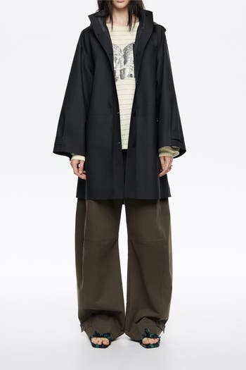 Midi trench with adjustable long sleeve with buttoned tab cuff and button-up front