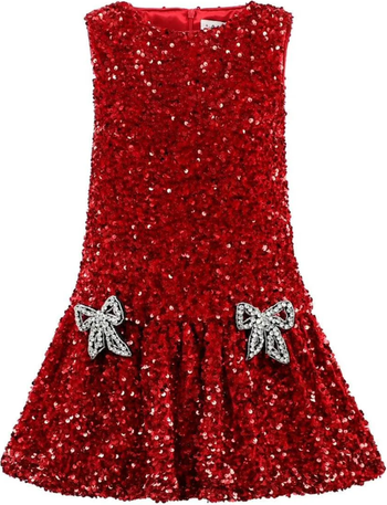 Stunning dress adorned with shimmering red sequins for a dazzling effect. Features elegant bow embellishments at the waist for added charm. Perfect for special occasions, holiday parties, and making a sparkling statement