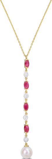 Ruby Cultured Pearl Diamond Lariat Necklace 10k