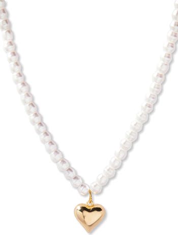 A strand of faux pearls brings classic luster to a necklace modernized by a polished heart pendant.