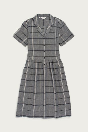 Effortlessly chic, this short-sleeve half-placket dress combines timeless style with modern comfort. Featuring a classic collar and buttoned placket, it offers a polished look, while the gathered waist adds a touch of feminine charm. Perfect for any occasion, this versatile dress can be dressed up with heels or kept casual with sneakers. Crafted from a soft recycled blend, it's as comfortable as it is stylish‚ your go-to for effortless everyday elegance.