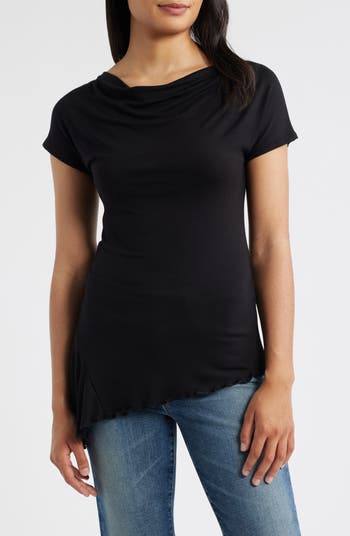 A supersoft jersey creates an edgy asymmetric hem on this short-sleeve top made to show off your curves.