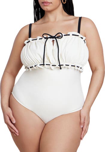 Keep it chic and streamlined in this ruched bandeau one-piece swimsuit, finished with adjustable ties for a custom feel. Soft gathering and stretch fabric create a flattering, vacation-ready silhouette.