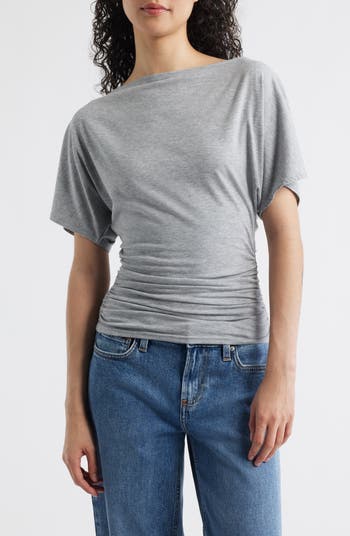 Abbreviated dolman sleeves enhance the easy drape of this soft stretch-kissed top made with an elongated neckline and rippled waistline ruching.