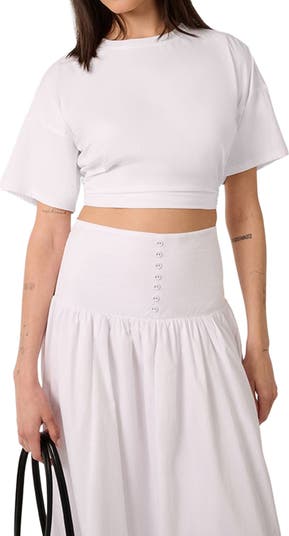 - This cotton jersey crewneck tee is designed with a dropped shoulder and cropped boxy fit at the top that slims at the waist with side ruching detail.