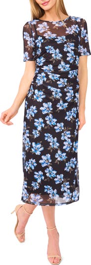 A floral print covers this short-sleeve midi dress made from stretchy mesh that's ruched at the sides for a curve-hugging fit.
