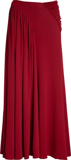 Smooth, gathered, and ruched panels of lightweight jersey harmonize in a graceful symphony of texture and movement in this fluid maxi skirt.