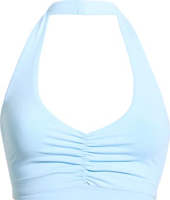 Get moving in this halter sports bra centered by a ruched detail in the front.