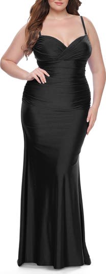Flattering stretch jersey long plus size prom dress with ruching and criss cross bodice. The back features adjustable lace up straps and ruching along the zipper. Back zipper closure.