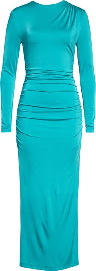 Stand out with the vibrant hue of this stretch-jersey dress with ruching at the shoulder, waist and hips for a curve-accentuating fit.