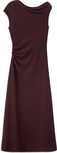 Abbreviated dolman sleeves and a wide neckline frame this figure-skimming maxi that's kissed with stretch and textured with rippled ruching.