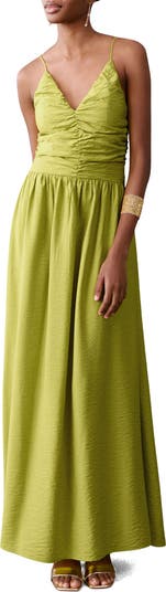 Luminous crinkle fabric lends dimensional shine to this breezy maxi dress. Slender spaghetti straps frame the V-neckline, while the ruched bodice adds rich texture and shape. A softly shirred skirt flows to the hem, creating an easy, graceful silhouette for warm-weather occasions.