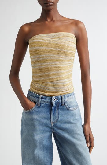 The Italian fashion house introduces another metallic masterpiece to its arsenal with this stretchy tube top shaped with artfully placed ruching