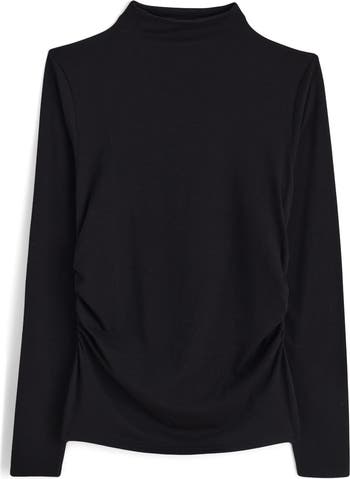 Buttery-soft in a cotton-modal blend jersey, this mock-neck top features figure-hugging side ruching and elongated sleeves.