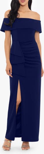 A soaring side slit races up the edge of this stunning crepe gown topped by an off-the-shoulder neck and designed with a flouncy tie detail.