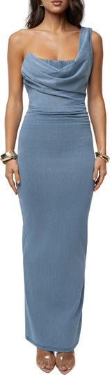 Deep ruching defines a figure-clinging maxi dress designed in a one-shoulder silhouette with a soaring back slit.