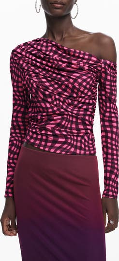 Rippled ruching adds texture and movement to this vibrantly checked top designed in a sleek shoulder-baring silhouette for night-out appeal.