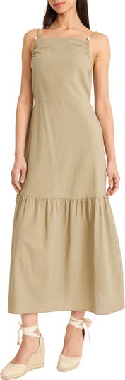 Keep things light and airy as you breeze through your day in this open-back midi sundress featuring a dropped waist and faux-pearl beads that add coastal flair to your look.