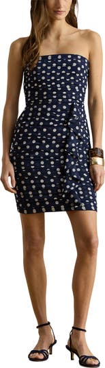 A cascading ruffle decorates the skirt of this strapless polka-dot cocktail dress featuring a softly ruched sheath silhouette cut from crinkled georgette.