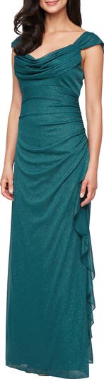 Twinkling metallic shimmer enhances the enchantment of this figure-skimming frill-trimmed gown accented with a drapey neckline and rippled ruching.