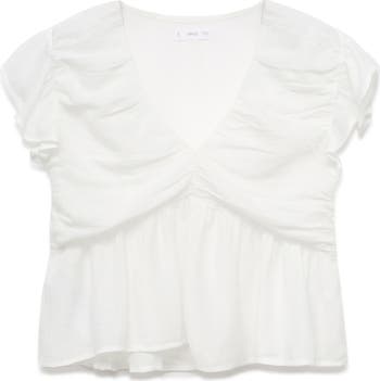 A ruched bodice defines this romantic top framed by billowing puff sleeves and a flouncy hem.