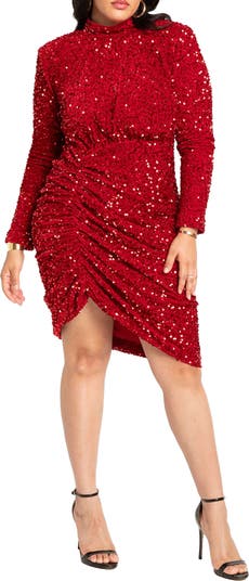 A sparkle-rich sequin mini with structured shoulders and flattering ruched skirt.