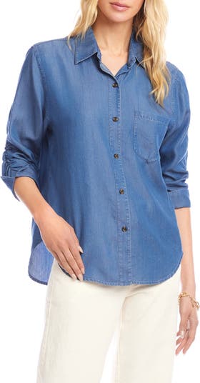 Scrunched sleeves sweeten the attitude of this breezy button-up shirt made with a back box pleat for easy movement and finished with a tuckable shirttail hem.