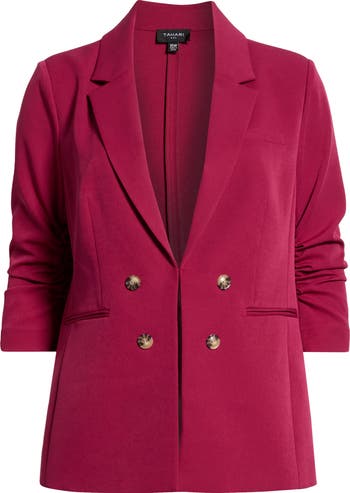 Scrunched sleeves enhance the texture and shape of this polished longline blazer fronted with faux double-breasted buttons.