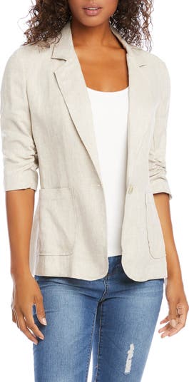 Elevate your warm-weather attire with this crisp and lightweight all-linen blazer that's punctuated by a single pearly button at the front.