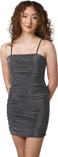 A ruched detail down the side brings just the right amount of texture to this stretchy glitter party dress that will have them feeling confident for their next big event.