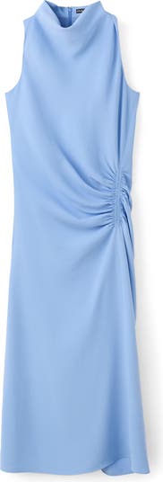Rippled ruching enhances the texture and dimension of this figure-skimming midi topped with a drapey high neckline.