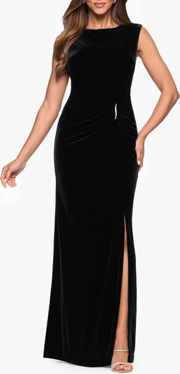 Rippled ruching and a kiss of stretch enhance the close-fitting silhouette of this glamorous gown made from sumptuous velvet and accented with a daring side slit.