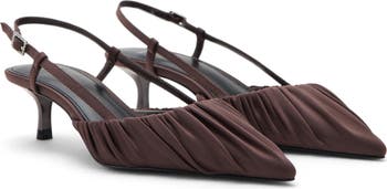 A gathered topline brings charming dimension to a slingback pump featuring a pointy toe and kitten heel for stylish and comfortable balance.