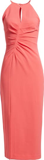Rippled waistline ruching shapes the silhouette of this figure-skimming gown cut from soft stretch crepe and accented with airy keyhole cutouts.