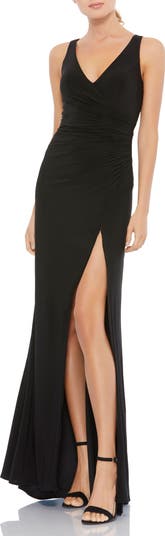 This simple stretch jersey faux wrap gown features a flattering V-neckline, bodice ruching, and a high front slit, offering an effortlessly elegant look.