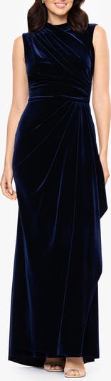A crossover neckline and ruching at the waist bring unique texture to a timeless column gown made from soft velvet with a touch of stretch for comfort and ease throughout your evening.
