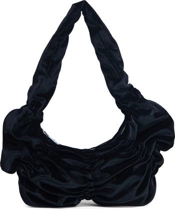 Allover ruching makes this zip-top shoulder bag made of plush velvet a statement-making accessory.