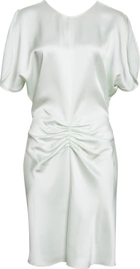 A signature silhouette from the British designer, this lustrous crepe-back-satin minidress celebrates your shape with a softly curved bodice and waist-defining ruching. Contrast pickstitching highlights the seams across the sides, back and tulip sleeves.