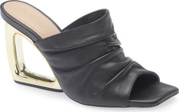 Elevate your look to starmaking status with this lofty sandal featuring a cutout wedge heel and artfully ruched leather strap.